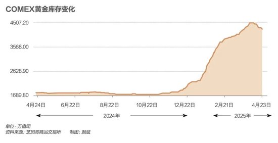受此影响,COMEX黄金库存一度升至历史新高。Wind(万得)数据显示,截至4月23日,COMEX黄金库存为4263.41万盎司左右。不过,随着实物市场紧张局势的缓解,这一套利热潮显现降温迹象。
